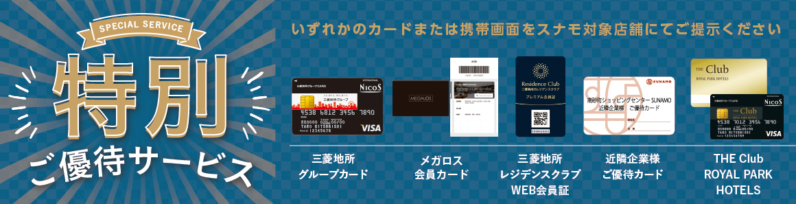 「三菱地所グループカード」「三菱地所のレジデンスクラブWEB会員証」「メガロス 会員カード」「近隣企業様ご優待カード」「THE Club ROYAL PARK HOTELS」会員様 スナモ特別サービス